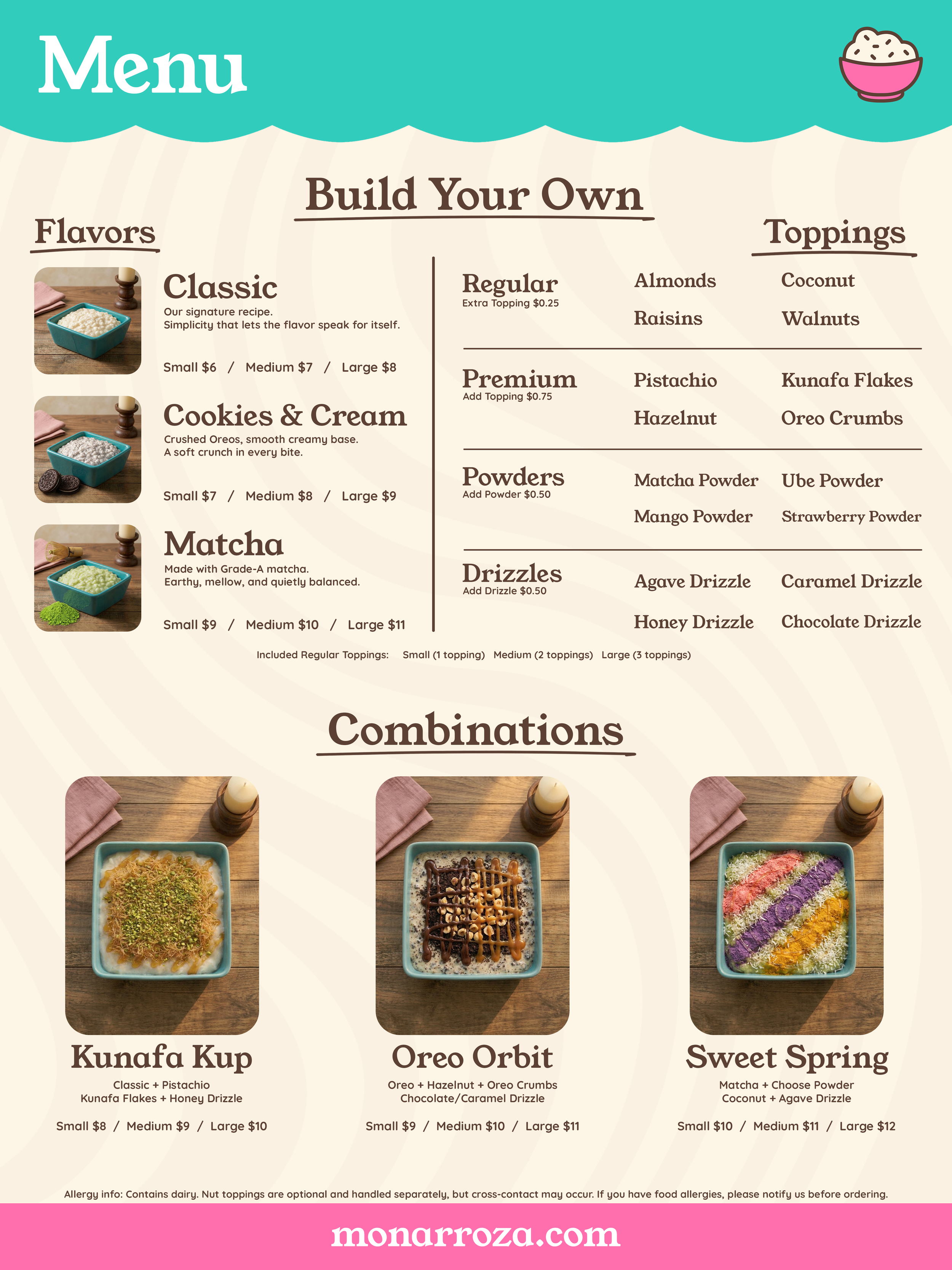 We keep our menu simple and seasonal. A few classics you can always count on, plus rotating flavors and toppings to keep every visit exciting.